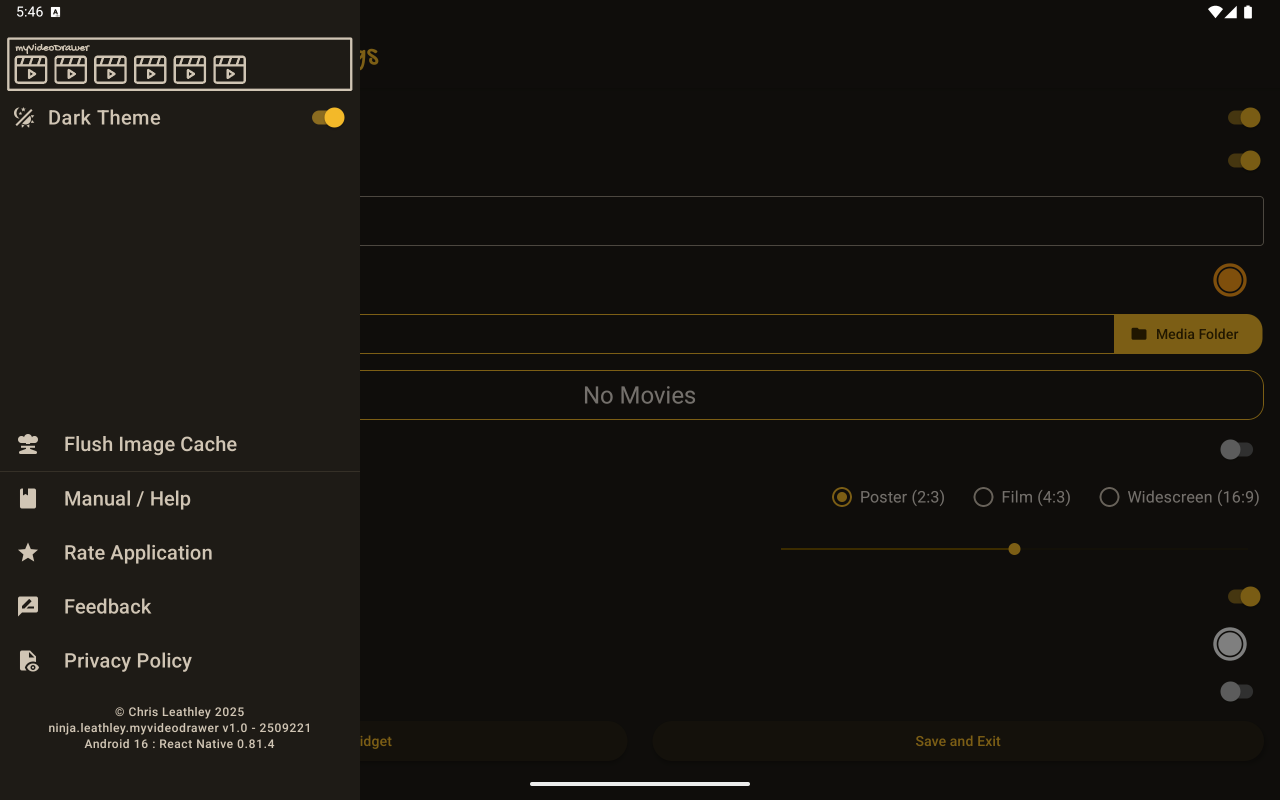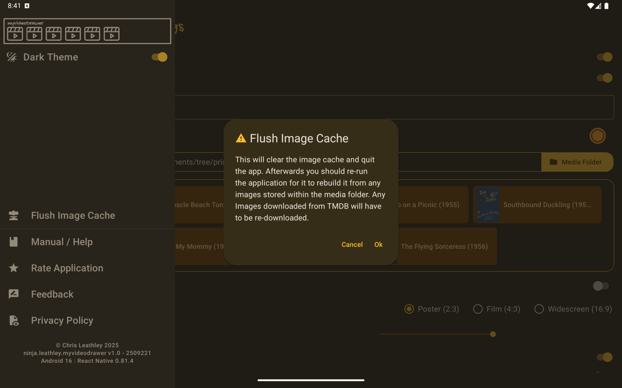 This brings up a confirmation dialog that allow you to clear the image cache. This will clear the cache and quit the app. Afterwards you should re-run the application for it to rebuild it from any images stored within the media folder. Any Images downloaded from TMDB will have to be re-downloaded.